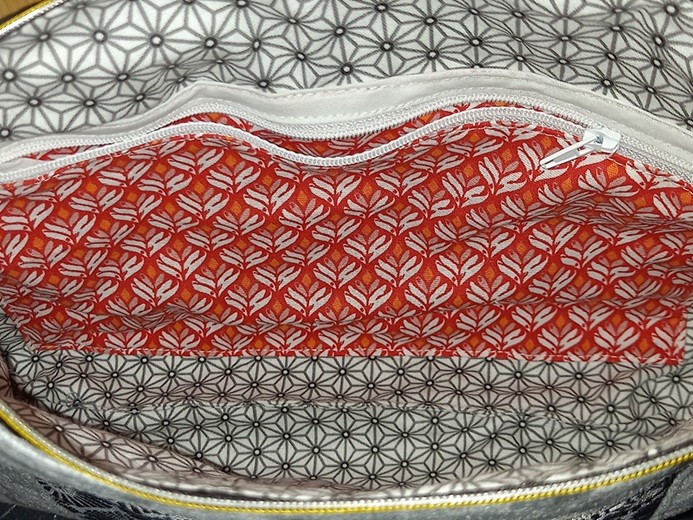 Il est doublé d'un tissu coton fantaisie avec une poche zippée à l'intérieur.