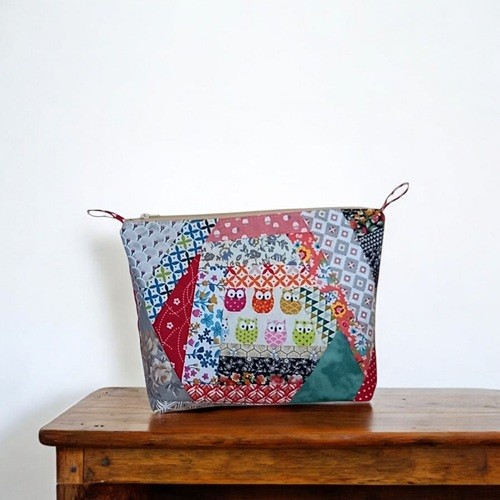 Elle est en tissu coton multicolore, façon patchwork, avec des poches à l'intérieur.