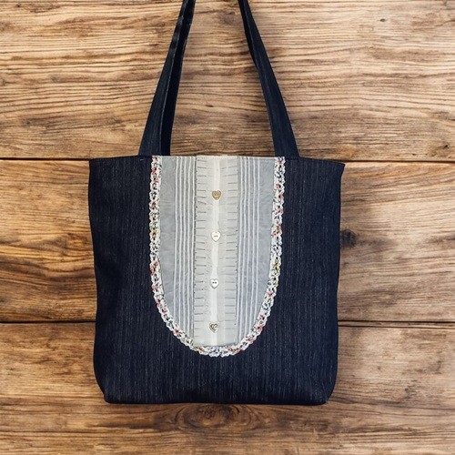 En tissu jean, avec un plastron blanc sur le devant, zippé pour un contenu sécurisé.