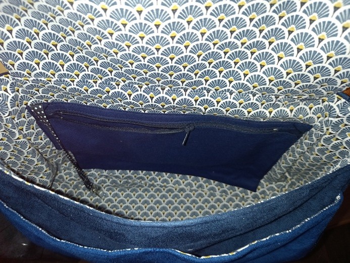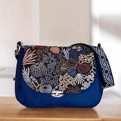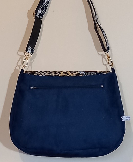 Ce sac besace est en suédine bleue assorti d'un jaquard aux motifs attrayants pour le rabat.