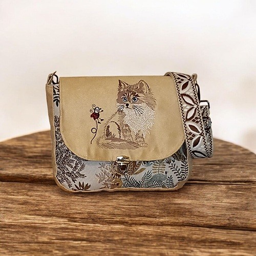 En suédine beige et tissu d'ameublement, un sac personnalisé avec un chat brodé sur le rabat.