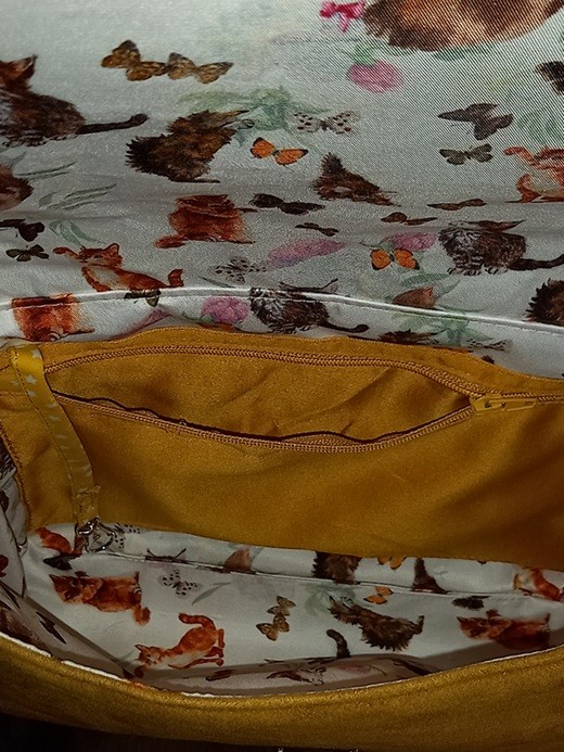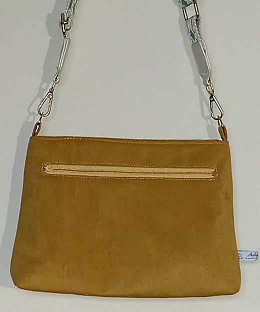 En suédine moutarde avec sa poche sur le devant en tissu japonais.