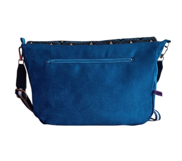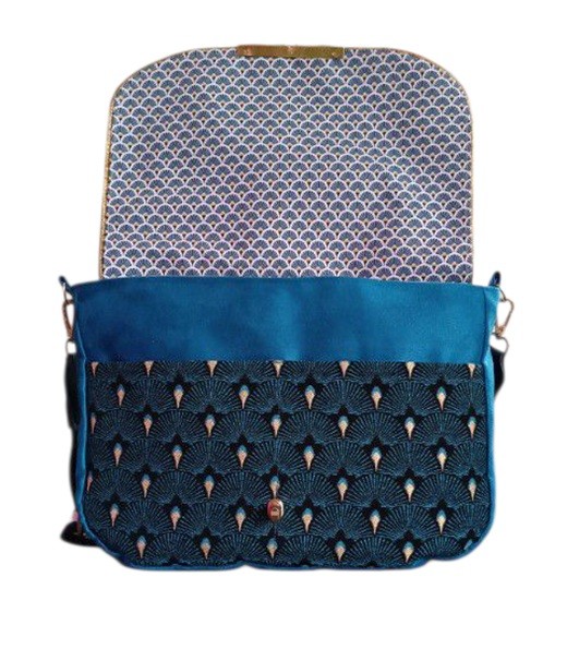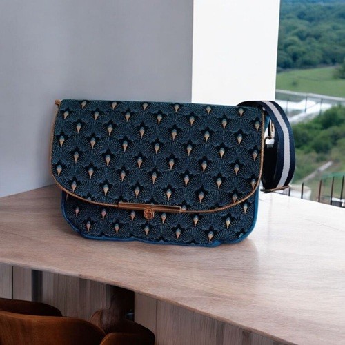 Grand sac en suédine et tissu d'ameublement aux motifs d'éventails., dans les tons de bleu pétrole.