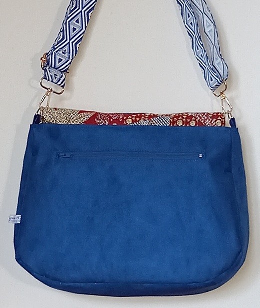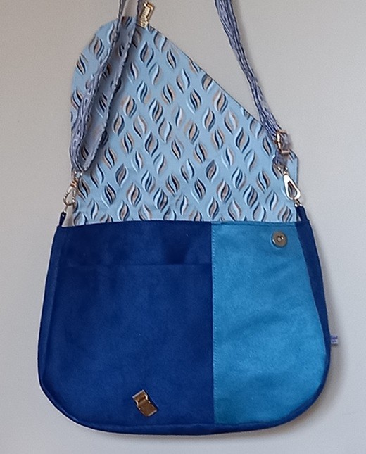 Ce sac est en suédine bleue, avec son rabat aux motifs attrayants,