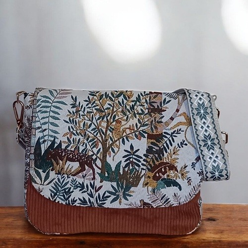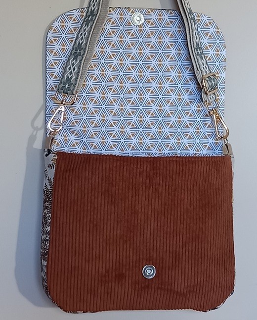 Ce sac à bandoulière en tissu de velours marron, et son rabat en tissu d'ameublement,