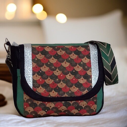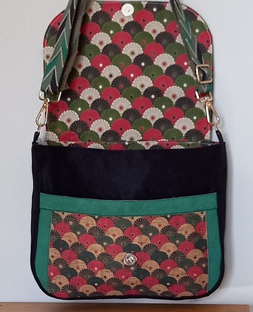 Il est en suédine noire avec du liège pour le rabat et la poche de devant.