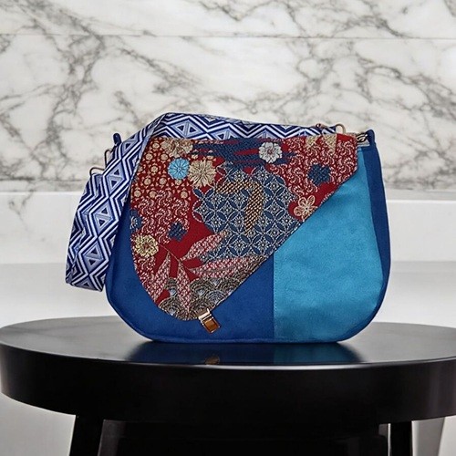Besace "Océane" en suédine bleue et tissu d'ameublement pour le rabat.