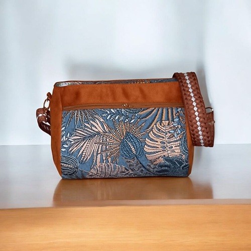 Besace "Océania" en suédine et tissu d'ameublement pour le rabat.